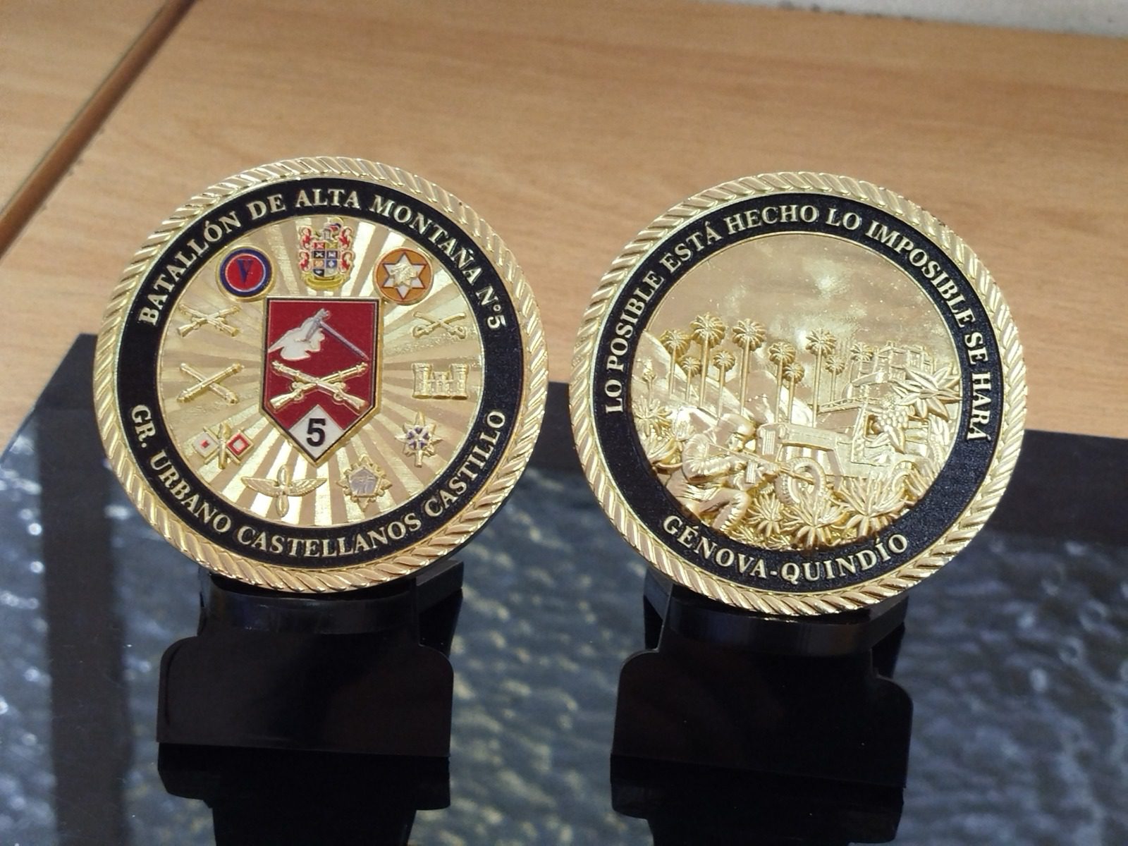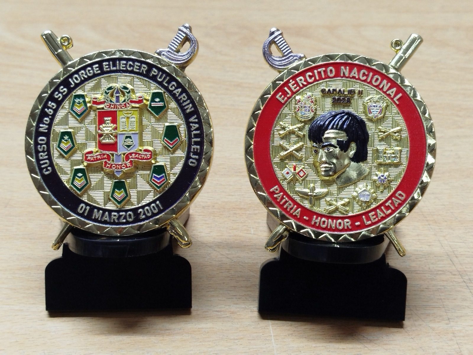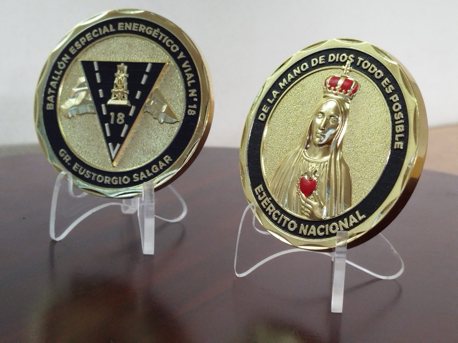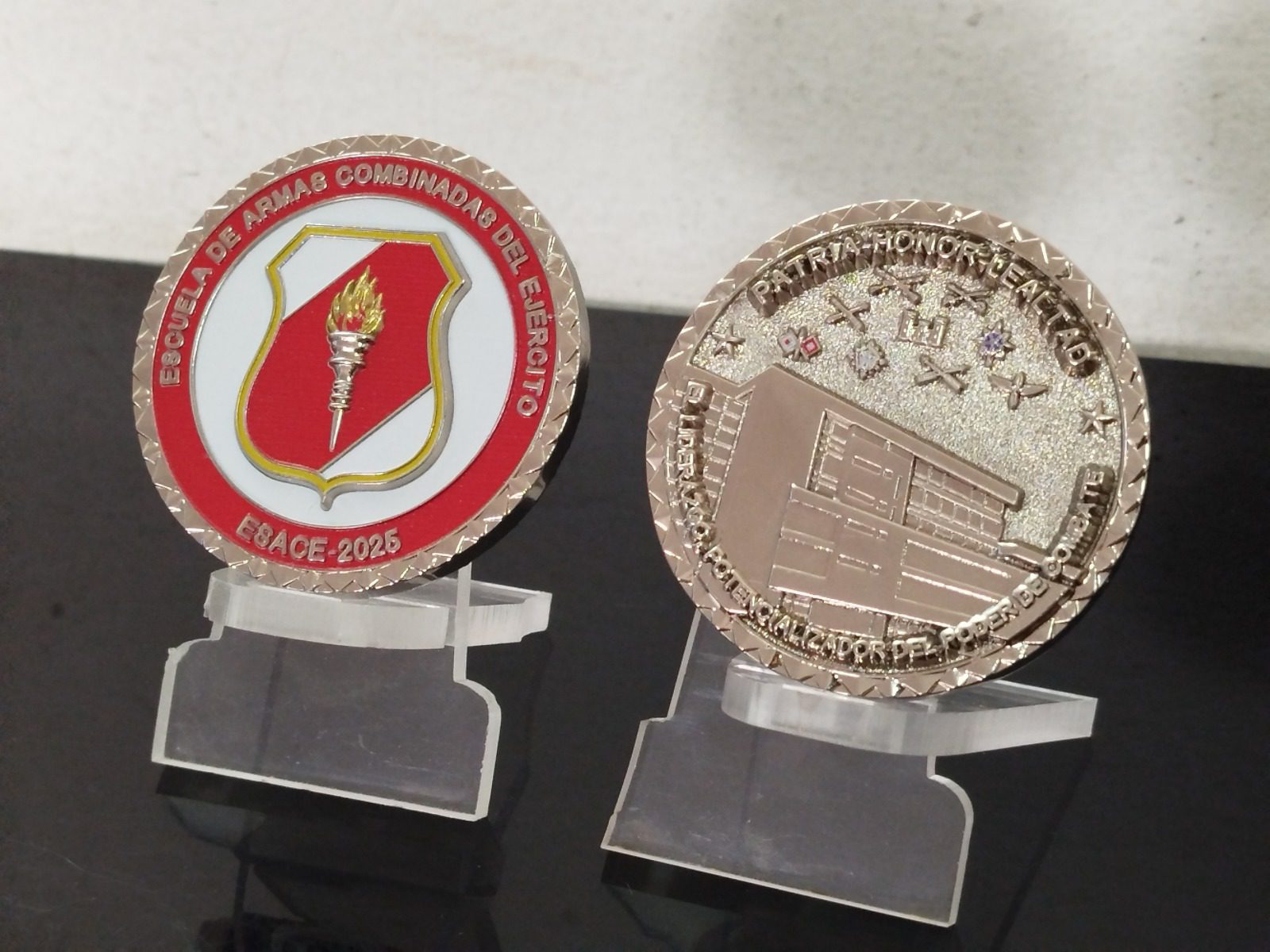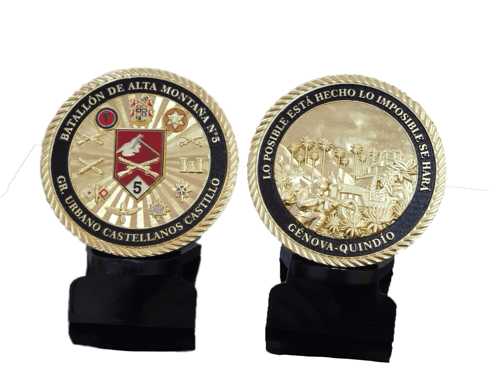 Símbolo de orgullo, logro y unidad en el mundo militar. Representan historia, tradición y pertenencia. En ClickMetal las fabricamos en aleación de cobre-zinc, con grabados y relieves detallados de alto realismo y excelentes acabados. Nuestros diseños  van desde la moneda en forma tradicional (redonda) hasta formas irregulares, las cuales dan un plus a la exclusividad.